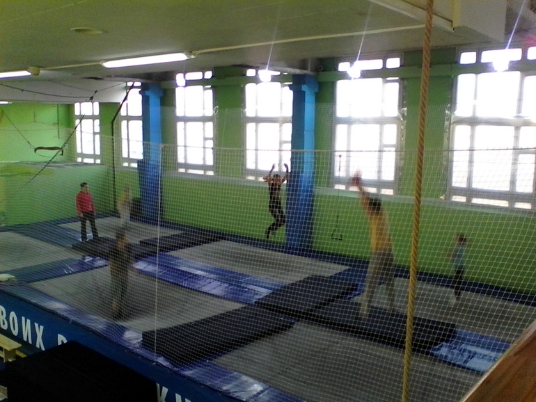 Так как записались мы на три часа в будний день, все наши ровесники в детском саду в это время, тренировка получилась индивидуальной. Дети ушли прыгать на батуты. Их шесть штук, тренер ходит посередине и дает задания. Нагрузка весьма и весьма существенная, вышли они все мокрые.