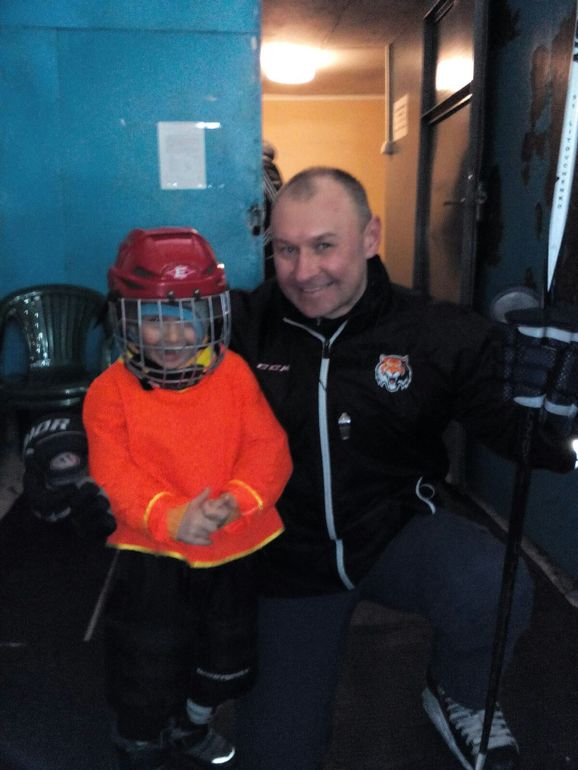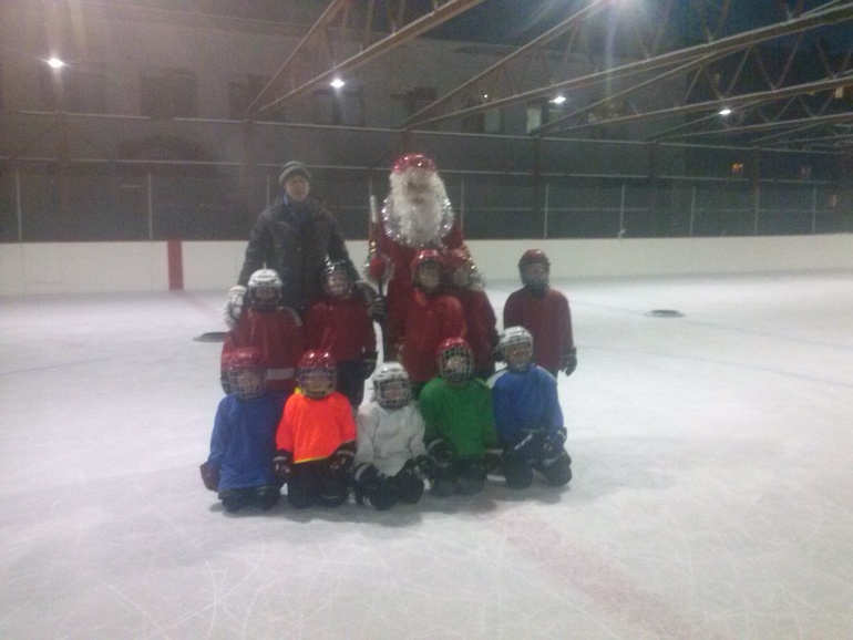 26 декабря,приехал дед мороз,провел праздничную тренировку,на улице -30,тренеровки с перерывом, 20 мин катаемся,10 греемся.на коньках стоит уверенно,выполняет все упражнения,20 мин со всеми,остальное время по индивидуальной программе,т,к самый маленьки,терпения на всю тренировку не хватает.тренировку отменили только на1 января,дальше ка обычно,ни каких праздников.6 января вручили клюшки.играть в команде не хочет,хочет быть вратарем.23 февраля поехали в комсомольск на соревнования и мастер класс с" Амуром".