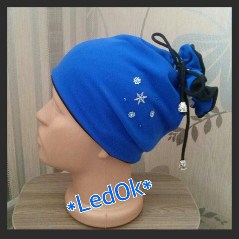 В комплект входит кофта и двойной шапка-снуд, который можно носить как шарф, а можно легко превратить в шапочку с кокетливым отверстием для хвостика или косички. Украшен аппликацией и стразами.