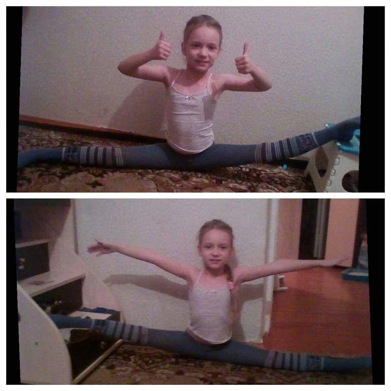 Акробатика, гимнастикаПока сидим на больничном с переломом носа,Даша усердно тянется и отрабатывает то что делали в зале.Сегодня позвонила тренер и сказала что в декабре будут первые соревнования,программу она составит.Всего за месяц реально отработать и хорошо выступить ???Даша конечно обрадовалась,она их очень ждёт,амбициозная у меня дама!)Ну и фоточки шпагатика (конечно если правильно сидит))).Мы новички в этом деле,пока не въехала что к чему)