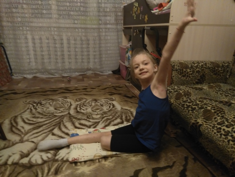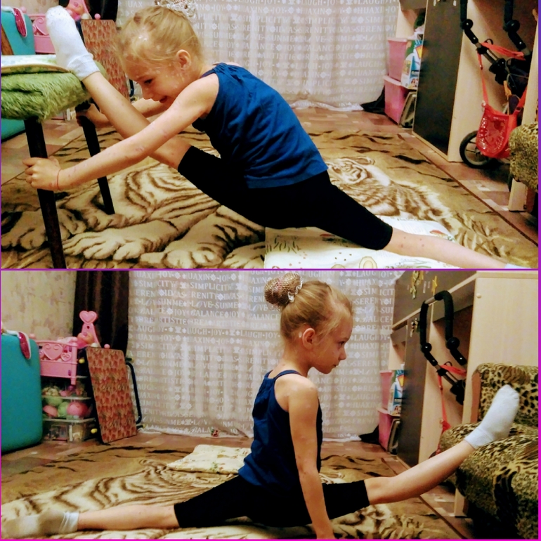 Последние 1,5 месяца ее не узнать,много трудится,много плачет,психует что не получается,но упорно делает...Мечтает стать великой гимнасткой (как она сказала))).Порой страшно и жалко смотреть на ее.