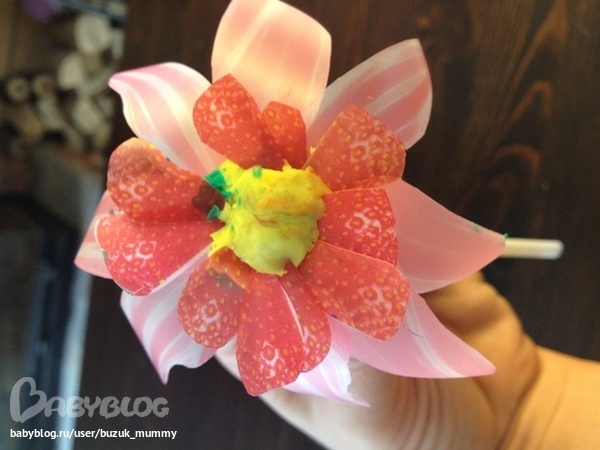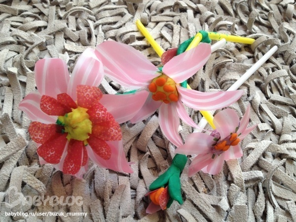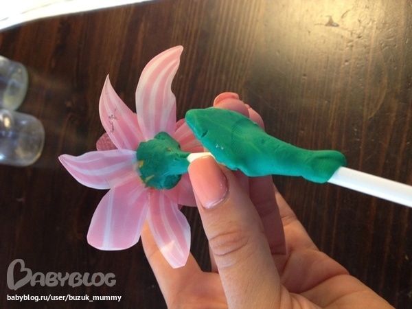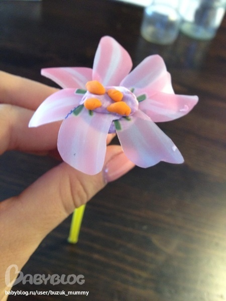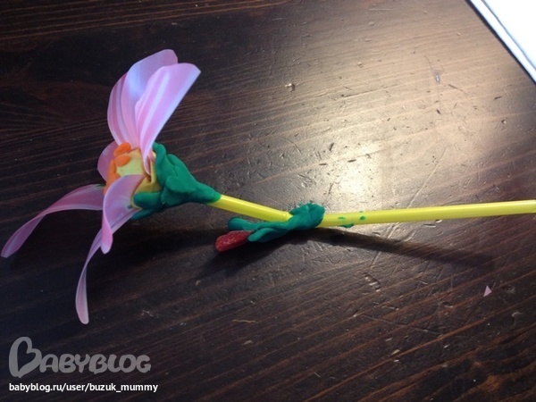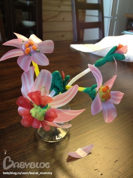 Также понадобятся трубочки (соломинки) можно брать зеленые, у нас были разных цветов, и пластилин. из пластилина делаем шарик и вставляем в него лепесточки. Потом можно декорировать маленькими точечками из пластилина серединку цветка, сделать бутончик, украсить листиком. Тут уже смотря как Ваша фантазия разыграется и какой возраст ребенка.:)