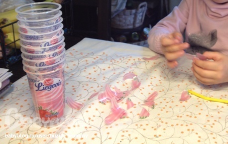 Из розовой части стаканчиков вырезам лепестки для будущих цветов. Можно захватывать часть зеленого рисунка на стаканчике и тогде получатся как будто зеленые чашелистики у середины цветочка.