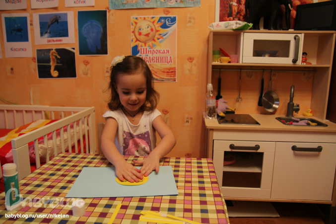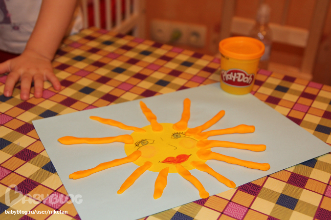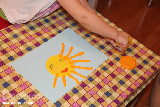 Предложила аппликацию - и само солнышко, и сами лучики подготовила из бумаги. Но ребенок решил делать лучики из пластилина. Ну что ж, я не против! )))))