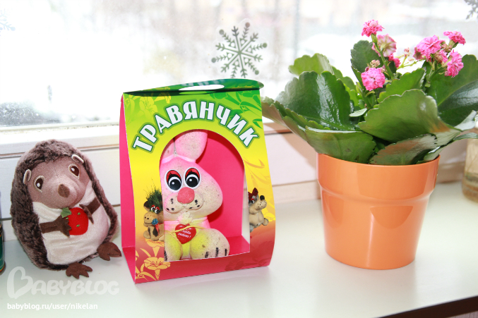 Потом решили, раз типа ВЕСНА пришла, сделаем ее хотя бы дома на окне (для истории - на улице сугробы и очень холодно). И замочили ТРАВЯНЧИКа, которого Насте подарил ее другой друг Мика (еще на ДР-перед НГ).