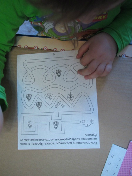 Тренируем руку. Степке очень нравятся вот именно такие лабиринт, когда есть одна дорожка и она все время петляет и нужно вести по ней ручкой. Девочки, если знаете где можно скачать подобные картинки, киньте, пожалуйста, ссылки.