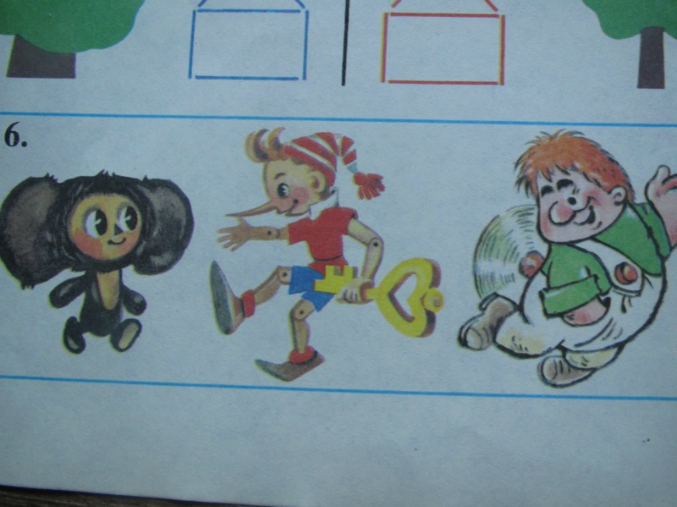 В верхних квадратиках мы рисуем простые фигуры, смотрим, куда они приведут, и пытаемся сами нарисовать фигуру в ее домике. Можно играть и с мелкими фигурками.