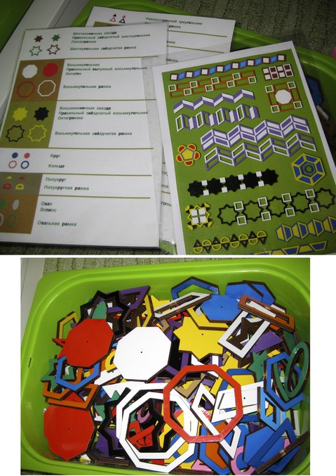 Все фигуры — перевертыши: желтого цвета, например, с одной стороны и черного с другой. Половина фигур — рамки, половина — вкладыши. Учебное пособие развивает художественное воображение, чутьё.