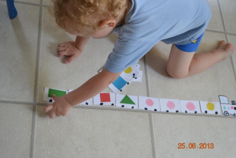 Сделали мы вот такую штуку. Вырезали с дочкой Паровоз, и к нему вагоны. Дочка рисовала колеса, и помогала наклеивать фигуры. Часть фигур мы решили нарисовать.