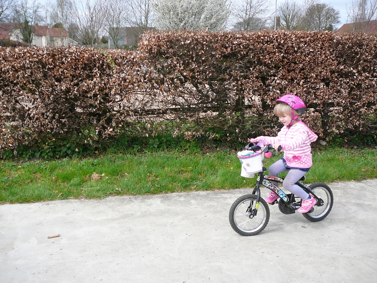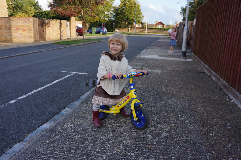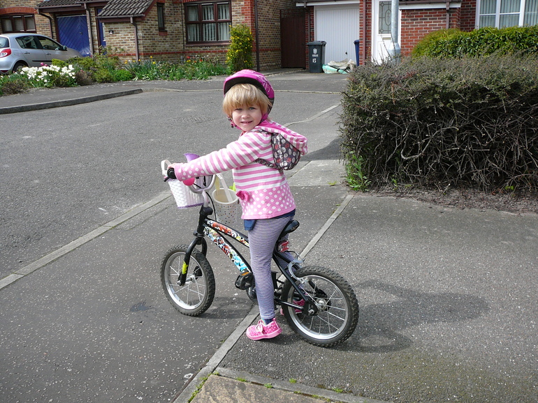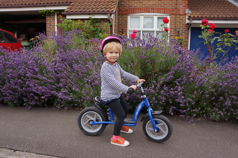 Когда Ладе было 3 года и 3 месяца друзья отдали нам велосипед своего сына, с дополнительными стабилизирующими колесиками. И хотя я слышала, что на 4-х колесах учиться кататься неправильно, Ладе так понравилось на нём ездить, что этот велосипед стал её любимым средством передвижения. Но мне и в голову не приходило, что уже можно пробовать ездить на двух колесах: казалось, Ладочка была ещё такой маленькой, а велосипед довольно большим. Так мы и ездили на четырех колесах до недавнего времени. И вот на днях мы попали в гости к друзьям, у которых сын уже вовсю гонял на двух колесах. И Лада попросила посадить её на этот велосипед. Я посадила, подтолкнула и вдруг поняла, что можно не держать: она поехала. Дома Лада потребовала у папы открутить маленькие колесики и со своего велосипеда. Я опять подтолкнула её, теперь уже и папа стал свидетелем того, что Ладку не нужно учить держать равновесие или крутить педали, получалось, что она это как будто бы уже умеет.