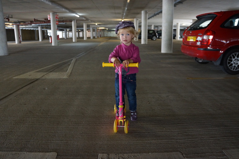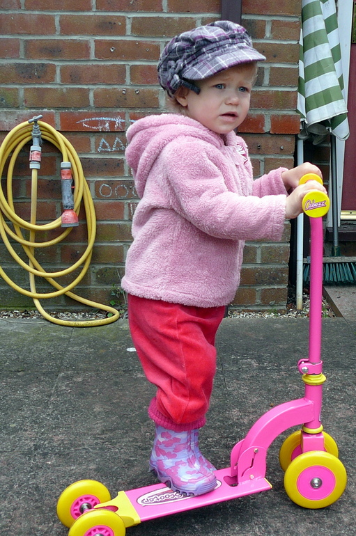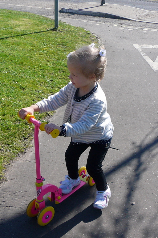 Следующим транспортным средством стал маленький самокат. Я выбрала модель, на которой сначала было 4 колесика, для устойчивости, потом можно убрать одно переднее, или заднее, или сразу оба. Лада довольно быстро с ним освоилась, но колесики мы так и не открутили, до сих пор катаемся на четырех.