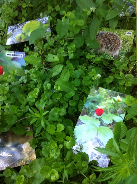 Никита научился отличать и узнавать «вживую» березу и сосну, рябину и костянику, мухомор и мох:) Вообще очень интересно играть карточками на природе. Мы прятали зайца в траве от волка и лисицы, садили сову и белку на ветки деревьев и помогали собирать ежику ягоды.