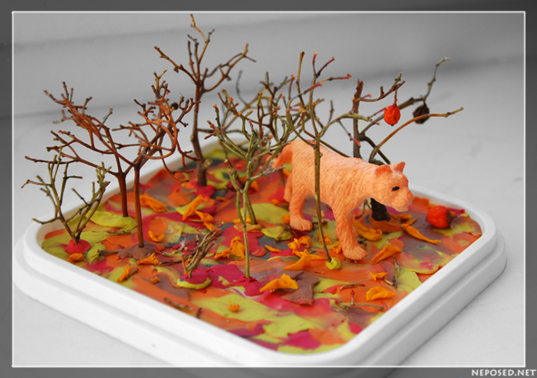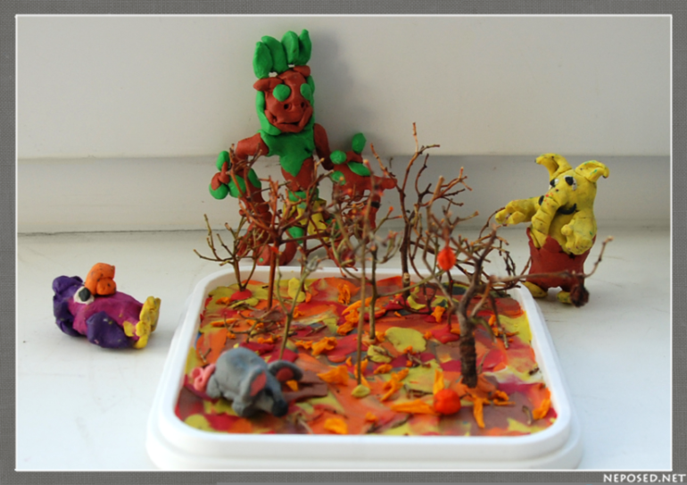 ТворчествоНабрали с Даней рябины, хотели сделать рябиновые бусы. Но Даня укололся иголкой и сказал, что больше никогда не будет их делать. Рябину пришлось выкинуть, а веточки от неё оставили и смастерили осенний лес.