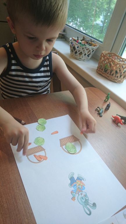Помоги разложить зайчику капусту в большую корзину, а морковку в маленькую. И скажи чего больше. (упражнение на количество и величину)🐇🥕