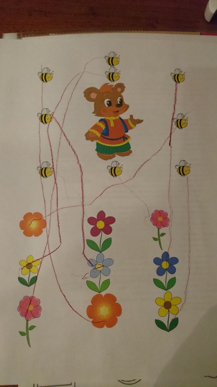 "Да я бы рад, да малина ещё не поспела, а мед пчелы стерегут). Помоги медведю, отвлечь пчел. Проверь, всем ли пчелам досталось по цветочку. (учимся сравнивать две равные группы предметов, понимать значение слов много, один и поровну)🐻🐝