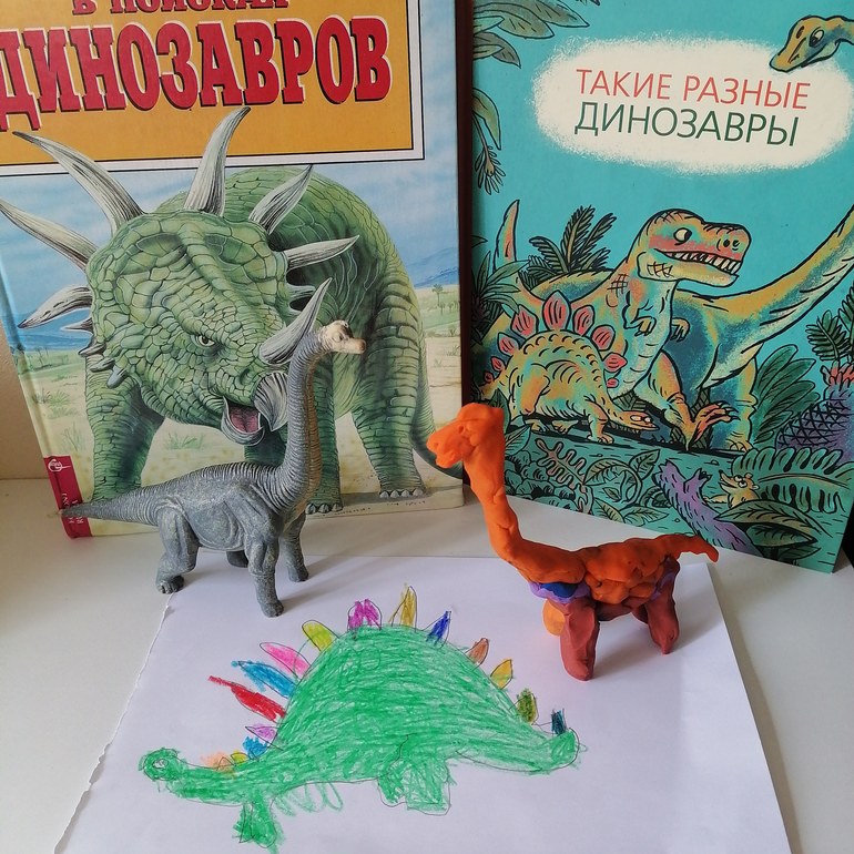 Затем лепили из пластилина, а потом по видео на ютуб рисовали стегозавра и любимого трицератопса