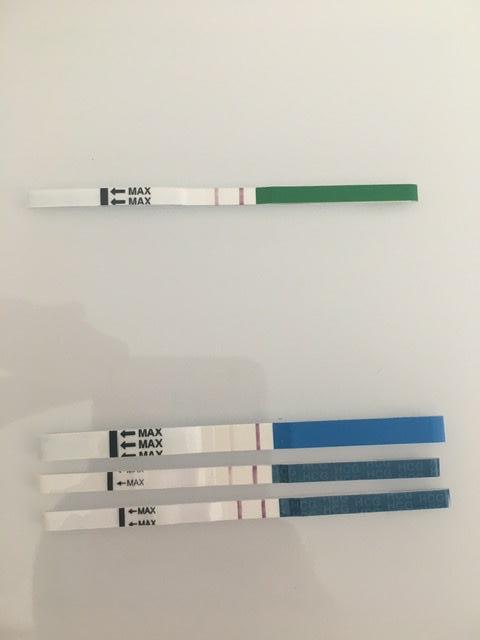 Ровно через 14 дней после О, т.е.(25ДЦ) измерила БТ-37,3, удивилась что t* высокая, ведь со дня на день должны были начаться месячные. Пошла делать тест, тест показал очень слабую вторую полоску(2 тест на картинке).