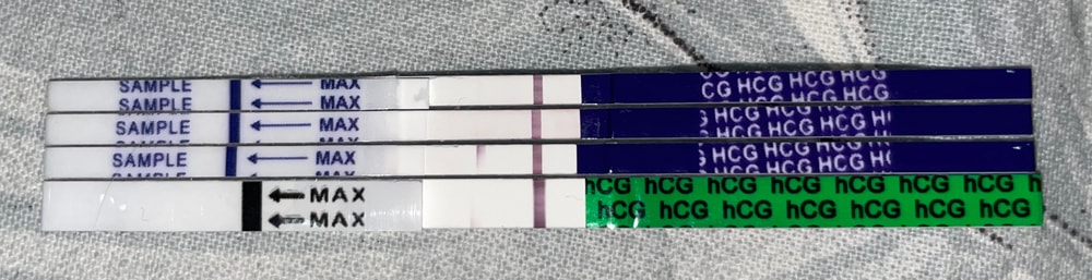 Сегодня (11 июня) решила ради интереса сделать тесты на беременность и на овуляцию. Тесты на овуляцию положительные (тестовая полоска ярче контрольной), сделала их 3 штуки. И параллельно ещё сделала тесты на беременность от леди чек (3 штуки) и от Qтест (1 шт). Один Леди чек показал вторую полоску (1 фото), Qтест «думал» долго, но тоже показал чуть виднеющуюся полоску. На остальных двух «призраки».