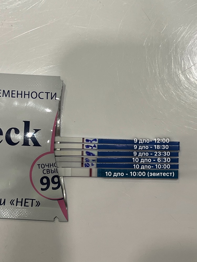 Сегодня ~ 10 дпо, из симптомов уже дня 4 ноет поясница, правый яичник и груди более чувствительные. Дома лежит пачка ледичек и купила вчера эвитест. Ледичек вчера (9дпо на фото) показал на 3-х тестах едва уловимую тень, на фото даже не видно, реагент подумала я и решила утром переделать эвик. Сегодня 10дпо сделала с промежутками ледичеки и эвик. Полочки на ледичеке по ощущениям поярчали, а эвик молчит. В прошлую беременности ледичеки мне показали чуть ли не за неделю до месячных, может и в этот раз они уловили хгч лучше чем эпики, или я себя накрутила?