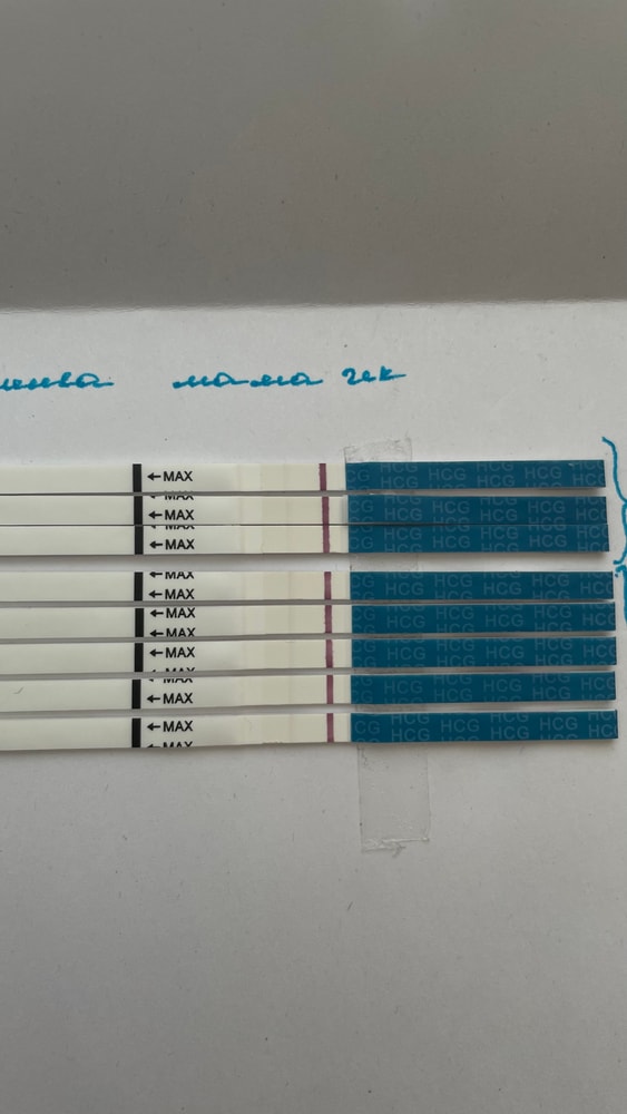 Еле дождалась утра, утром так же две полоски на всех еще 5 тестах🥰 Вроде и осознание приходит, но все же капля сомнений остается)) До задержки пока буду делать тесты, а там уже на хгч пойду. Скоро у супруга день рождения, как бы еще домолчать до него, что бы главный сюрприз сделать))