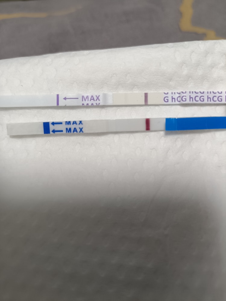 Верхний тест розочка(будьте уверены), а нижний-фрау, нижний сделала через пол часа после розочки. На втором тоже что-то виднеется, но такое незначительное, возможно я себе и надумала эту полоску)