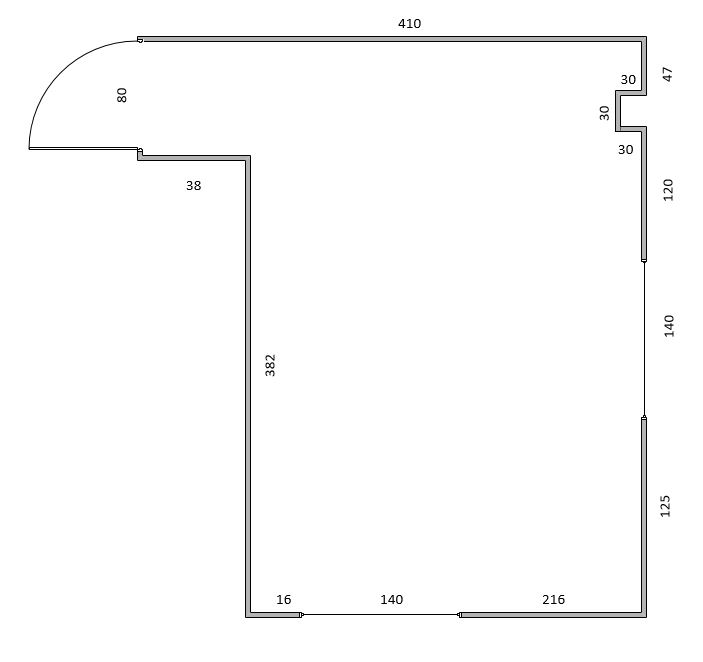 На правой стене несущая балка с гранью 30 см. Дверь из коридора. 2 окна по 140 см (выходят на восток и юг).