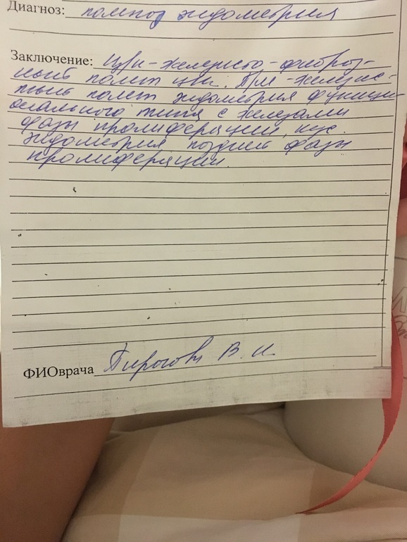 Проходит время и я созреваю к гистероскопии. Показаний по сути нет, но все же направляют. 9 июня проводят Гистеру и обнаруживают 2 полипа (выписку приложу). Иду с гистологией к врачу, Мне ничего не выписывают, говорят "должна беременеть от взгляда". Скоро будет два года без Ляли... что мы имеем: якобы два здоровых супруга. Из не проверенного только трубы думаю. А и кстати через неделю после гистероскопии вырезали аппендицит, на этом фоне сказали подождать пару циклов, чтоб спало воспаление. Но пару циклов уже прошло... надоело ждать. Посоветуйте что нибудь... что делать дальше?