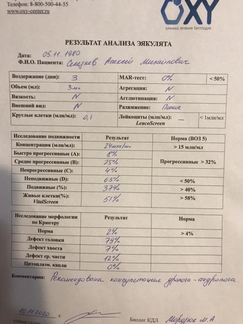 Слушай ... конечно не айс, но приведу пример нашу у нас количество 79 , морфология 3 , подвижность а+б 28. Андролог сказал страшного ничего, при таком количестве все норм. Инфекции у нас отрицательные . Сейчас скину наше назначения