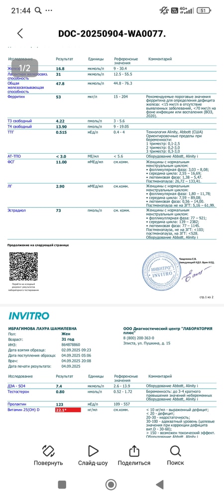 Мама двух сыночков и дочурки, тестостерон тоже ниже 1 , это тоже говорит о снижении резерва. Витамин д нудно принимать вам корректировать. От 2000-5000 т тогда и резерв может раскачаться. Железо можно тоже скоректировать если ваш вес более 50 кг. То профилактику делать. Но опять же если вы сдавали все в один день в цикле с кровотечением не по правилам сдачи ,то не очень информативно смотреть ферритин. Его сдают через 7-10 дней после начала цикла в идеале чтобы оценить реальный результат. ТТ-г хороший. В вашем случае лучше низкий чем высокий. Так как высокий влияет на качество ооцита. Принимаете какие то препараты для щитовидной железы?