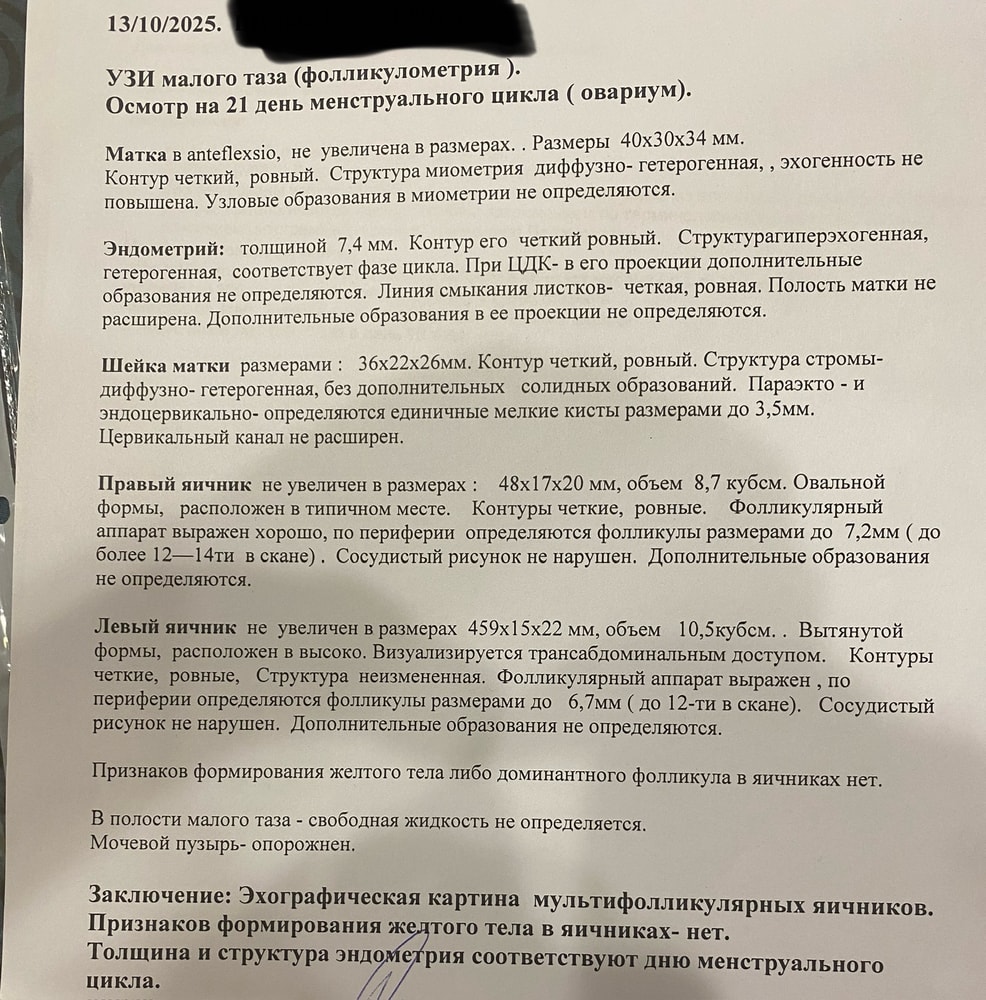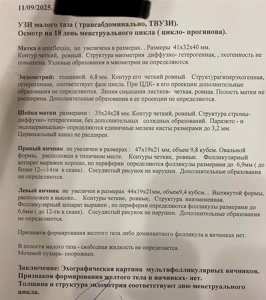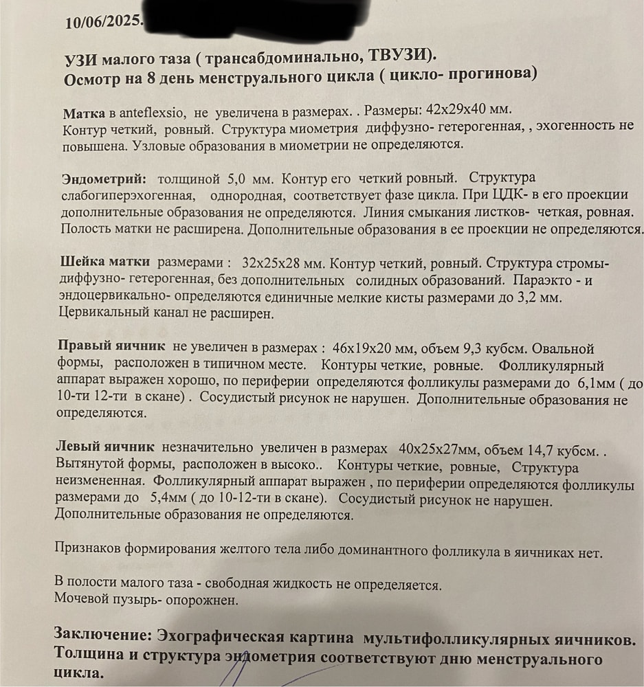 Гинекологические болезниДобрый вечер) захотелось и мне поделиться тут своей ситуацией и главное, послушать советов и мнений (очень важно для меня, так как столкнулась в этим впервые, еще мало что знаю и понимаю). Мне 29, супругу тоже. С марта 2025 года активно начали планировать беременность (до этого около года, после первичного обследования, просто пытались). Я сразу обратилась к гинекологу (по совету знакомой, которой она реально помогла - 5 лет дочке). Скажу сразу, проблемы у меня были: после 2х ковидов более 3х лет нерегулярный цикл, овуляцию не отслеживала, т.к. не планировали очень то. В общем (о чем сейчас конечно сожалею) отношение было ровное: задержка - тест, ну может стресс, пришли на неделю-две позже - ну пришли же. Других жалоб не было. В общем ситуация с марта по настоящего времени (фото буду прикладывать):
