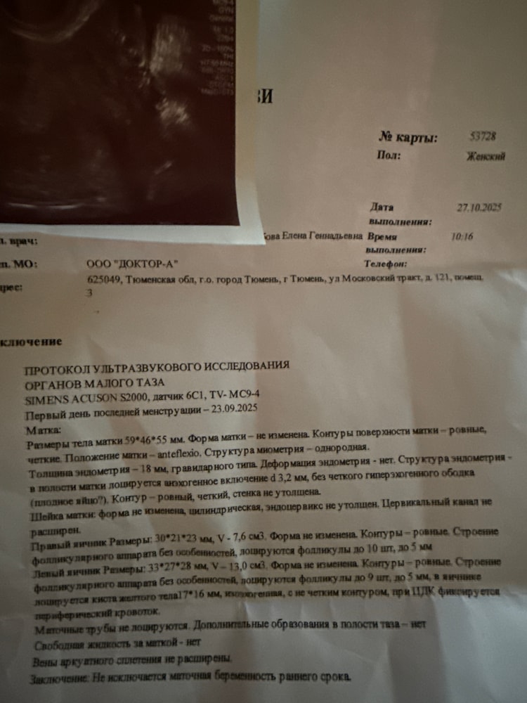 Ya K, у вас беременность раннего срока. Тест положительный, значит вырабатывается хгч. Есть беременный эндометрий, есть жёлтое тело. Через 1-1-1,5 недели будет видно плодное яйцо. Через 2-4 недели будет виден эмбрион.