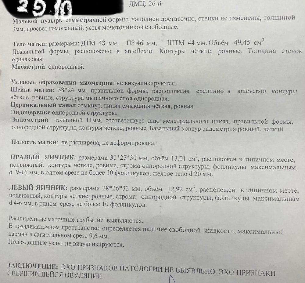 Ждем дня Х/тесты/признаки БДобрый день, мы с мужем планируем беременность и в этом месяце произошло что то странное… дата начала последней менструации 4 октября закончилась 8, овуляцию отслеживала всю неделю почти сначала были бледные еле заметные полоски, 23 октября жирные четкие полоски, 24 октября стала чуть бледнее но яркая, вообщем положительный ещё был, с 25 числа тест уже отрицательный, через день после овуляции 26 числа стала странно себя чувствовать и во время овуляции болел живот то справа то с лева и поясница, так через день после начали болеть соски грудь вообще не болела, живот то болит то нет и с поясницей также, позже появилась небольшая изжога, нога немеет правая не знаю с чем связано), все это началось за 2 недели до месячных в середине цикла скажем так 29 числа пошла на узи спустя 6 дней грубо говоря гиня сказала что у меня была очень хорошая овуляция, что её признаки сохраняются до сих пор так скажем, желтое тело СПРАВО 20 мм, мои симптомы и все это очень похоже на беременность сказали большая вероятность, я очень была рада и надеялась, после узи появились выделения с комочками, до этого были просто густые белые выделения, утром тоже самое, пошла опять к гинекологу она сказала это может быть при ранец беременности сказала какие свечи купить, вечером я попала в не большое ДТП, удар был в поясницу и копчик, живот начал тянуть и поясница сильно болеть, начала болеть сама грудь помимо сосков, живот прошел относительно быстро, а вот поясница ломит до сих пор, решила сходить ещё раз на узи очень испугалась, на узи я пошла 31 через два дня после предыдущего и уже к другому гинекологу, моя на больничном, она сказала, что у меня отсутствуют даже косвенные признаки беременности и желтое тело с ЛЕВО А НЕ С ПРАВО, я не понимаю как такое может быть, очень расстроилась и совсем забыла про фото узи, она мне его не дала только заключение и как выяснилось уже не дадут оно не сохранилось, сказали переделывать, я очень доверяю своему гинекологу, но по заключению второго врача о беременности не может быть и речи в этом цикле, я не понимаю как желтое тело оказалось с лево если оно точно было справа в этом я уверена, а вторая врач уверяет во Братном, живот в обуляцию хоть и болел с двух сторон но больше справа помойму, вообщем я не понимаю есть ли шанс что я беременна или все таки нет, я понимаю что это слишком рано, до задержки ещё 4 дня, но мне плохо уже неделю по симптомам даже больше это же не просто так, я прикреплю фото заключения, могу ли я быть беременна, если посмотреть на эти заключения хотябы, подскажите пожалуйста фото узи относятся к 29.10, без фото 31.10