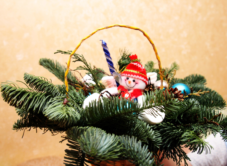Потом резали веточки елей разных видов и наматывали на основу, а потом вставляли в корзиночку. И в итоге все украшали