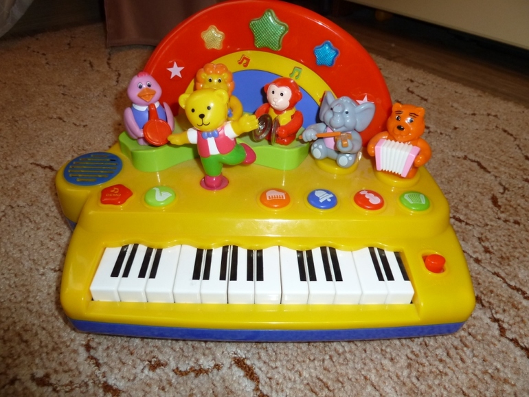 Пианино - имеет 12 белых и 9 черных клавиш. Имеются также 6 кнопочек с изображениями разных музыкальных инструментов (пианино, колокольчики, гитара, саксофон, барабан, труба). Нажав какую-либо кнопочку, услышим голос соответствующего инструмента.