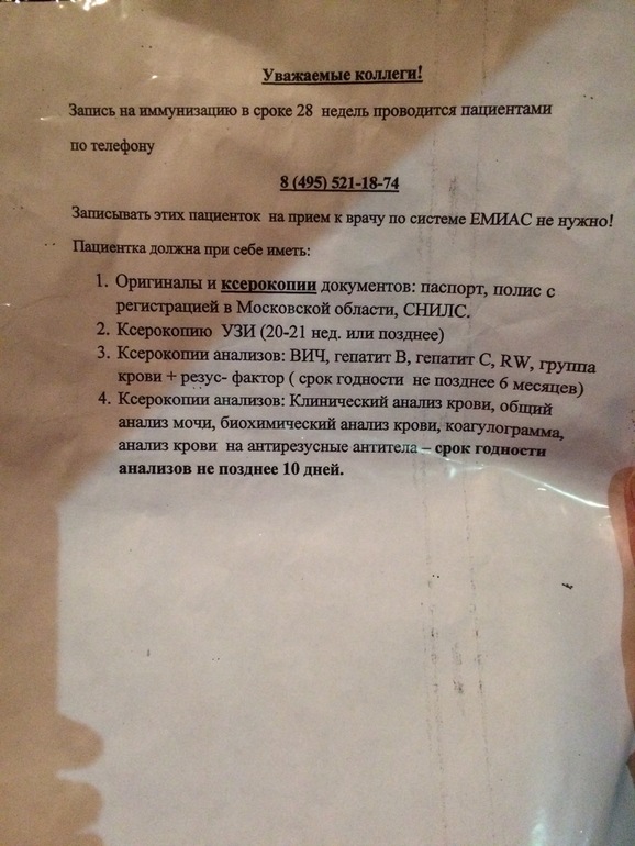 Елена,документы нужны все по списку.Анализы под цифрой 4 все свежие должны быть.Мне в ЖК дали коагулограмму старую,которую при постановке на учёт делали,пришлось пересдавать.Укол сделали в день прихода.Никаких ктг,УЗИ,осмотров на кресле и прочего не делают. Если документы все в порядке,идёте беседуете с врачом по теме чем болели,есть ли аллергия и т.п.Потом 3 сек сам укол и домой.