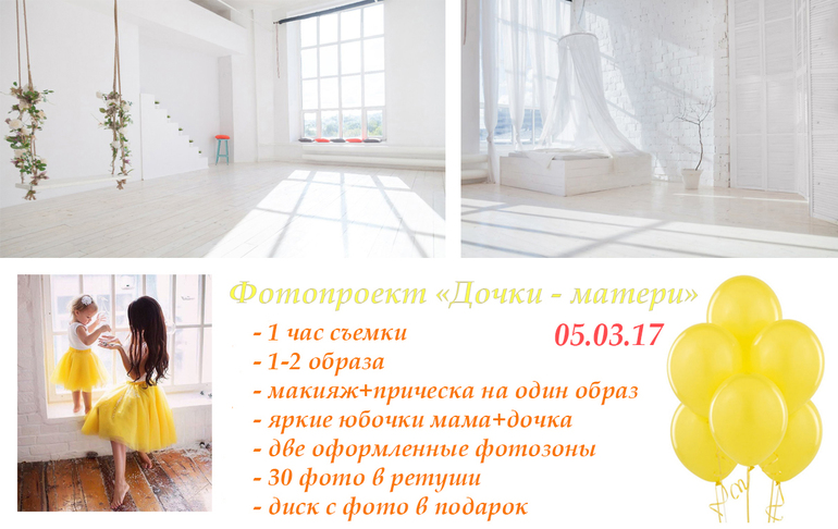 Вас ждут: Прическа и макияж от мастера, Две фотозоны с индивидуальным декором, Юбочки мама+дочка, а для мальчиков галстуки-бабочки в тон к юбочкам, часовая фотосъемка, 30 фотографий в ретуши, диск с фотографиями в подарок!