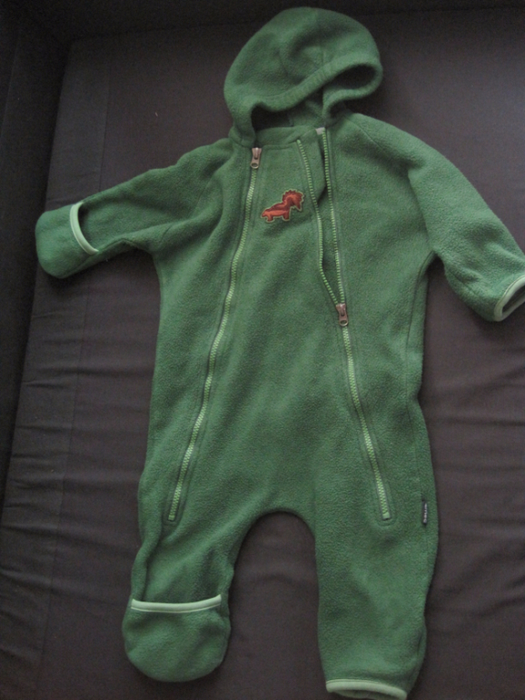 Размер 12 месяцев ( носили от 65 до 86 см роста).Материал зеленый толстый флис, застежка на 2 молнии, отворачивающиеся манжеты на руках и ногах, капюшон. Очень удобный и теплый. Замеры: от подмышки до конца рукава 20 см, от места крепления воротника до места соединения штанин 44 см, от места соединения штанин до конца штанины 21 см, ширина по переду от подмышки до подмышки 37.