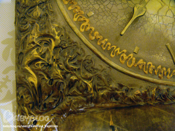 Это самые первые часы. Сделаны были на МК. Фанерная основа, акриловый грунт, декупажная карта, Структурный гель Таир, акриловые краски, кракелюр Creal Crackle, затирка маслом, бутум, витражная лента.