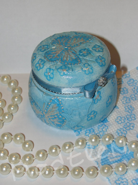 Девочки,насмотревшись ваших шедевров решила тоже попробовать,решила начать с мелкого.баночка из под крема ,получилась вот такая мини шкатулочка.