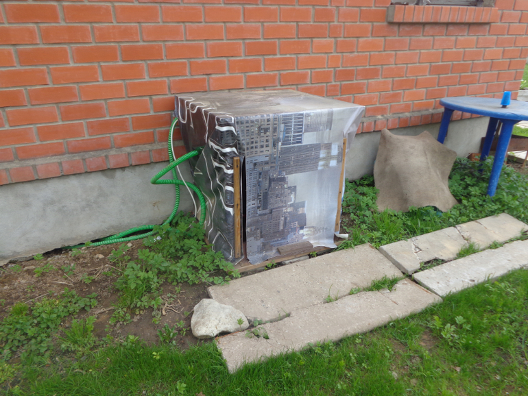 Это старый стол, который перевернули вверх дном. Сверху налепили кусок деревяшки и все обтянуто плакатиком)) Дверь есть открывается вверх и утяжелена брусками, чтобы не улетала))) Станция прикручена к столу снизу - у нее есть для этого отверстия, чтобы не ускакала от вибрации. Шумит она кстати не так уж громко. Да и вибрирует не очень сильно, так что все эти мегасооружения из мужских мануалов - просто перестраховка)))