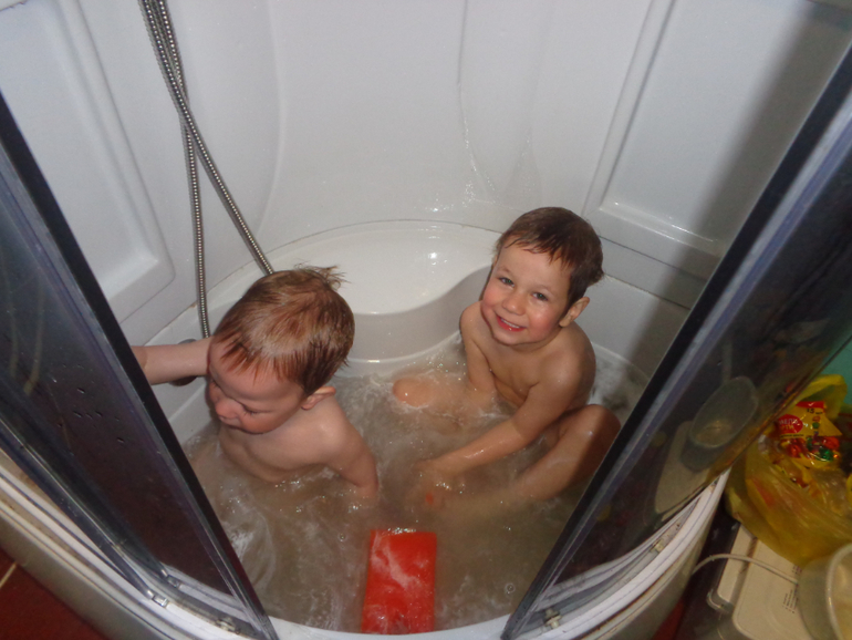 Бойлер взяли самый дешевый в оби. Тыщи 3 стоил, на 80 литров. От бойлера шланг идет обратно ко второй гребенке - на душ и уже в раковину. Как понятно. рядом душ, а к раковине еще доползти надо.. У нас это происходит конечно же... под домом))) И холодная и горячая водичка)