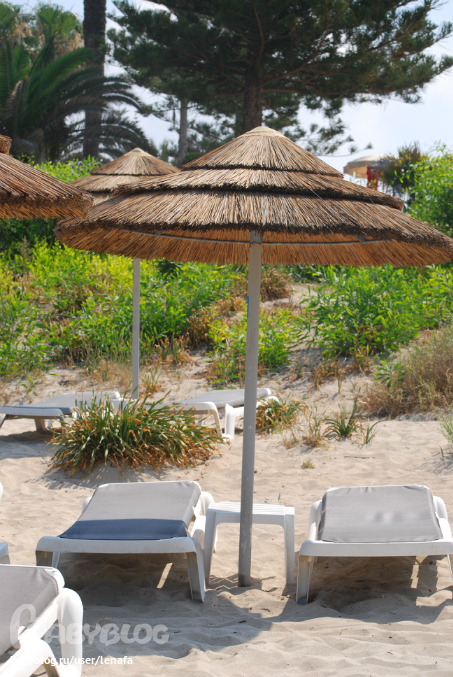Такие лежаки и зонтики на пляже за отдельную плату. Мы обходились без них, удобнее было распологаться ближе к воде.