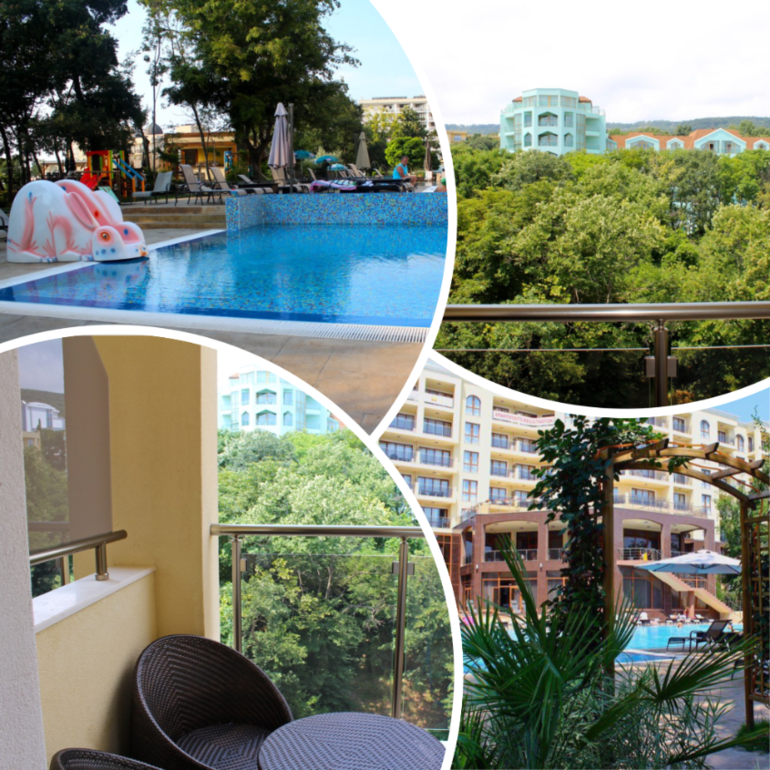 🙅 От апарт-комплекса до набережной курорта Золотые пески всего 70 метров. Там различные батуты, аттракционы для детей. Предоставляется бесплатный автобус до аквапарка. В Варне расположены: большой парк с зоопарком, аттракционами, дельфинарием (шоу: в 12.00, в 15.30, в 17.00).