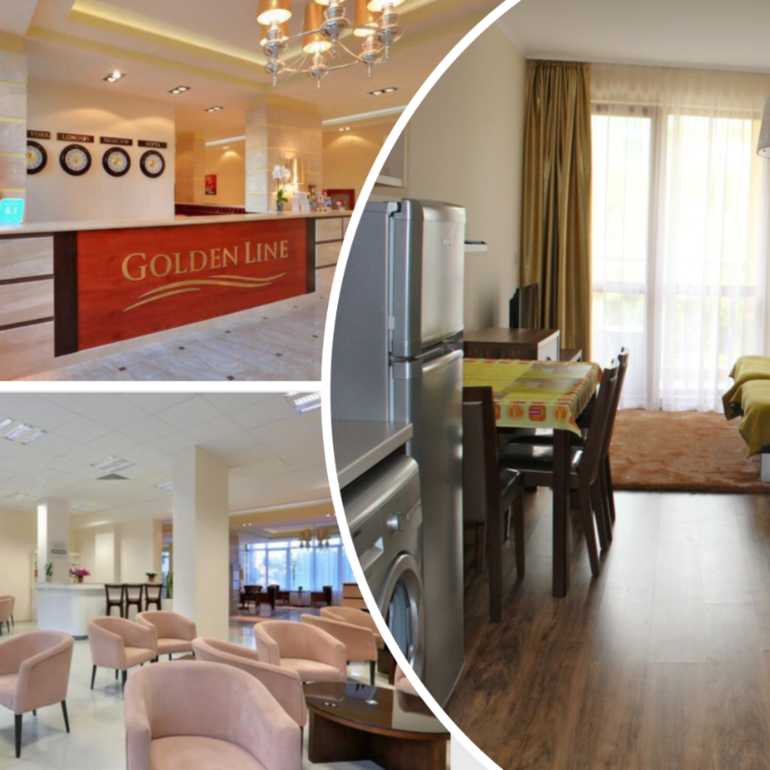 🚙 Как добраться до «Golden Line»: Проблем доехать до апарт-отеля не возникнет, так как ходят рейсовые автобусы, такси. Время в пути: 25 минут на такси и 35-40 минут на автобусе. Такси ориентировочно стоит 25 лева (12,5 евро). Апартотель 4*, построен в 2012 году.