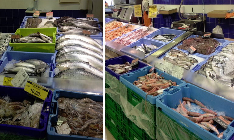 Семга - 7,5 евро/кг (если брать тушку или пол тущки. то цена будет в Меркадоне 5 евро/кг)