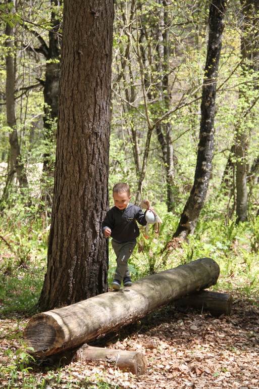 После обеда и дневного Егориного сна поднялись вверх по горнолыжной трассе. Канатно-кресельная дорога в межсезонье работает только по выходным, а мы были на неделе, поэтому наш подъём был пешим.