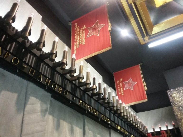 По всему периметру боевые знамена частей, принимавших участие в битве за город: