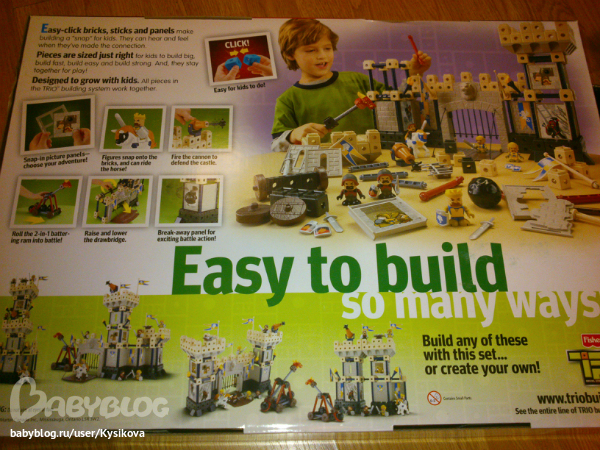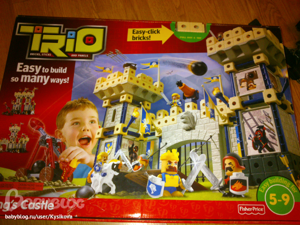 Конструктор Трио от Фишер прайс - Большой замок. Возможность собрать несколько вариантов замков, пушка стреляющая ядрами, катапульта и человечки в комплекте. Очень занимательная игрушка!!!! Размер коробки 53*38*13.