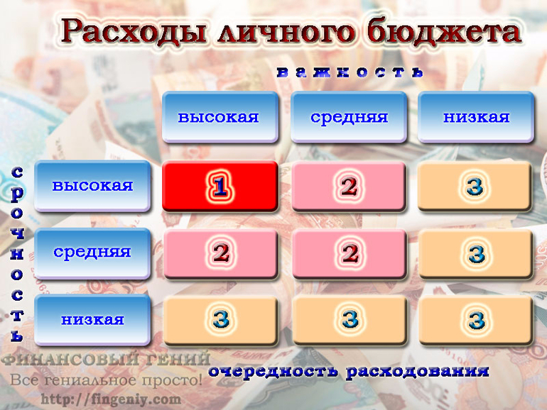 Цифрой 1 обозначены расходы, которые следует оплачивать незамедлительно, в первую очередь: важные и срочные расходы.