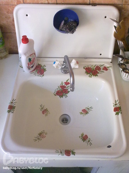 Молодец! Очень хорошо потрудилась!!! Прям радостная такая раковина - в цветочек )) Не переживай насчёт того, из чего она сделана и когда )) Ты мою не видела просто )Она огромная, чугунная, эмалерованная, 2 чаши и эмаль желтеет в течение каждого дня - с утра - белая, вечером мою добела свою жёлтую раковину )